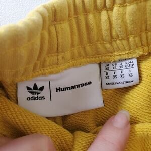 Features yellow color, elastic waistband with drawcord, front and back zip pockets, embroidered Humanrace logo on left leg, and Adidas trefoil logo on back pocket