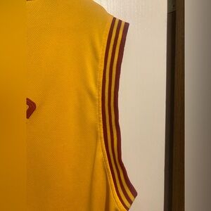 Adidas jersey in rich gold. Features bold red lettering and Cavaliers logo.
