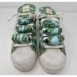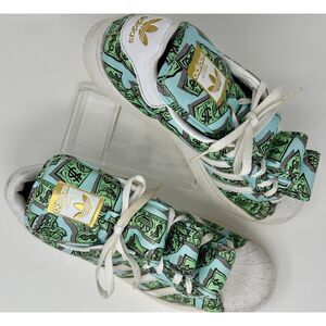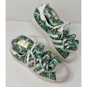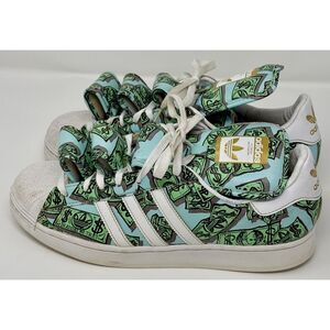 Pre-owned Adidas JS Money Superstar HP6596 sneakers for men, size 10, designed by Jeremy Scott. These iconic shoes feature the signature money print in green and gold on premium materials, blending bold style with the classic Superstar silhouette. The sneakers show normal signs of wear but remain in good condition with no major damage. Perfect for collectors or fans seeking a rare limited edition pair. Authentic Adidas product. Please review photos carefully. Ships securely with tracking. All sales are final.