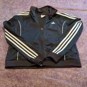 Black with white Adidas stripes down the arms, size medium.