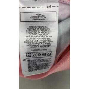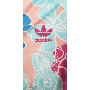 Features a bold floral print in pastel pink, blue, and aqua with magenta accents. Iconic pink embroidered Adidas Trefoil logo on front chest. Signature Adidas three stripes run down both sleeves. Ribbed pink collar, cuffs, and bottom hem for a classic sporty look.