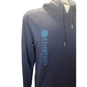 Adidas James Harden “Thirteen” hoodie in men’s size Medium. Features Harden’s logo on the front with vertical “Thirteen” lettering and a bold back graphic with basketball court design. Classic pullover style with drawstring hood and kangaroo pocket. Made with sustainable cotton blend as part of Adidas’ eco-conscious line. Dark navy/charcoal colorway with blue graphic accents. Pre-owned and in excellent condition with no stains or holes noted. Perfect for casual wear, training, or any NBA fan of Harden’s signature line.