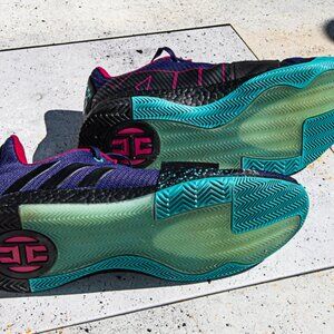 Adidas "James Harden Vol. 3 Drew League Basketball Shoe Purple/Black and hi Rez Aqua Men size 10 1/2 great used condition 1 small spot where black rubber nicked on side