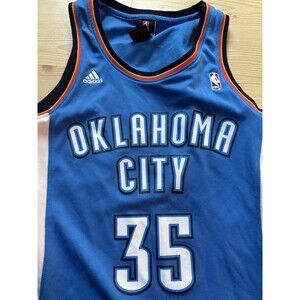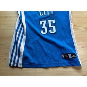 The product is an officially licensed Adidas Kevin Durant Oklahoma City Thunder jersey for women in size small. Made in Nicaragua, the blue jersey features the player's name and the team's logo, perfect for NBA fans looking to show their support during the regular season. Ideal for basketball enthusiasts who want to represent their favorite team and player on and off the court.