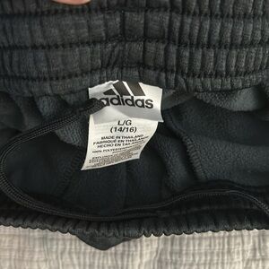 Comfortable and stylish, these Adidas kids track pants are perfect for active days. Featuring a sleek black design with iconic white stripes, they offer both fashion and function. Size large 14/16