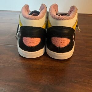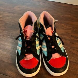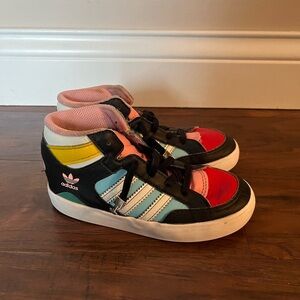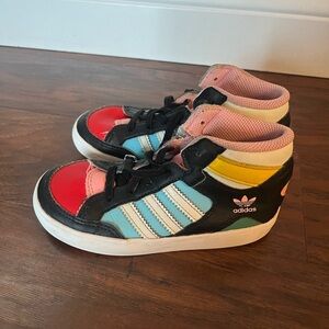 Brighten up your child's wardrobe with these used, but great condition Adidas high-top sneakers. Featuring a vibrant mix of red, blue, yellow, and black, these shoes offer both style and comfort for active kids. Those are well cared for and come from a smoke free home.