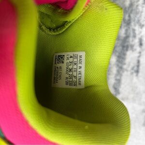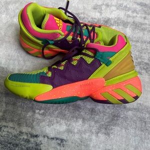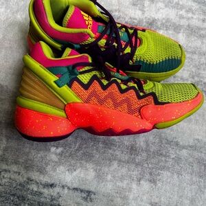 Brighten up your child's wardrobe with these vibrant Adidas sneakers. Featuring a striking neon green and pink design, these shoes are perfect for active kids who love to stand out. Comfortable and stylish, they're ideal for everyday wear. Daughter wore for basketball, indoor only