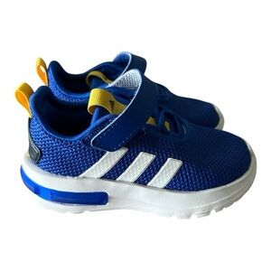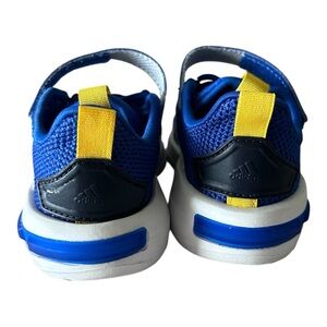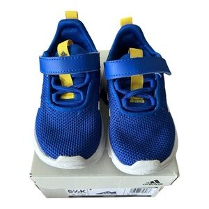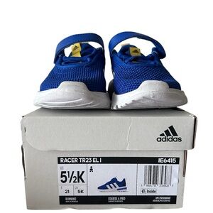 Vibrant blue sneakers with white soles. Perfect for active play. Easy strap closure.