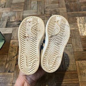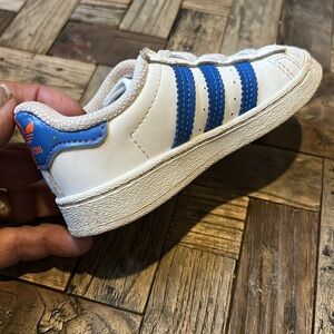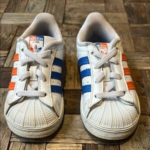 Adidas Kids Superstar Athletic Shoes Sneakers. white with blue and orange stripes and accents. Ortholite soles. Size 7K