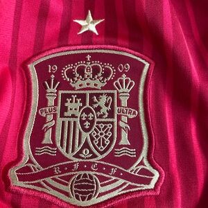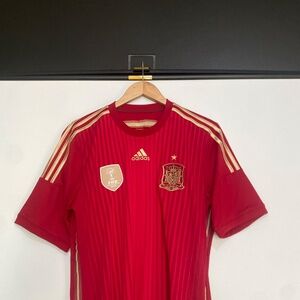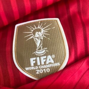 - Spanish Football Federation badge on the left chest and the 2010 FIFA World Cup Champions badge on the right.