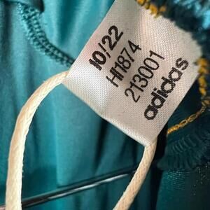 Cheer on LA Galaxy in style with this official Adidas 2024 Men's Away Soccer Jersey, size XL. This jersey features a sleek slim fit and is crafted in a striking Myshgrn/Teccogo colorway — a deep green base with vivid yellow accents on the shoulders and sides. The eye-catching multicolor pattern around the collar adds a unique and authentic touch inspired by cultural motifs.