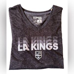 Stylish Adidas tee with LA Kings logo. Soft gray fabric. V-neck design. Perfect for casual wear.
