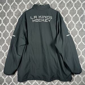 Lightweight lined vented windbreaker jacket with zip pockets and LA Kings spellout on the back. Kings logo on the chest and NHL logo in the sleeve. Great condition!!! No flaws detected.