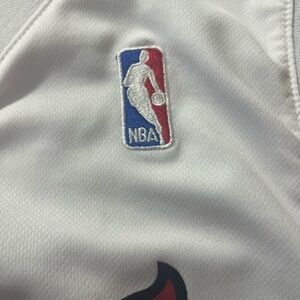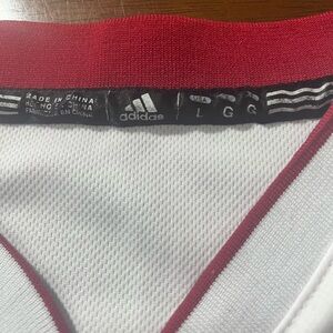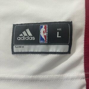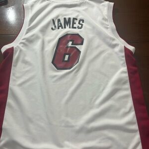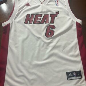 Adidas youth basketball jersey featuring LeBron James Miami Heat logo. White with red accents. Ideal for sports fans.