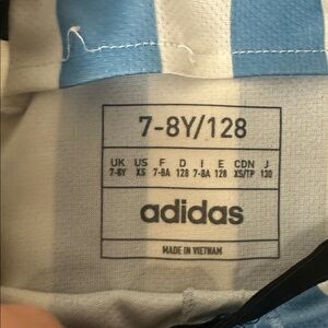 Light blue and white stripes. Adidas logo on the tag. Made in Vietnam. Used condition. Please review photos