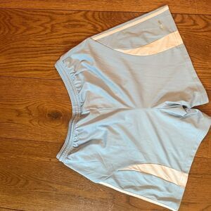 Stylish light blue athletic shorts with white stripes. Perfect for workouts or casual wear. Small mark in crotch area. Not visibly seen when wearing unless sitting criss cross and even then it’s light.