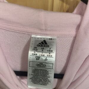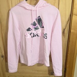 Light pink hoodie with bold Adidas graphic. Comfortable and stylish.