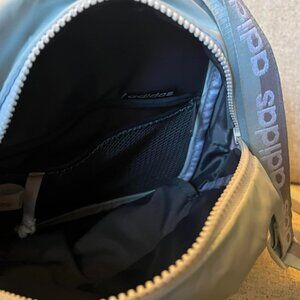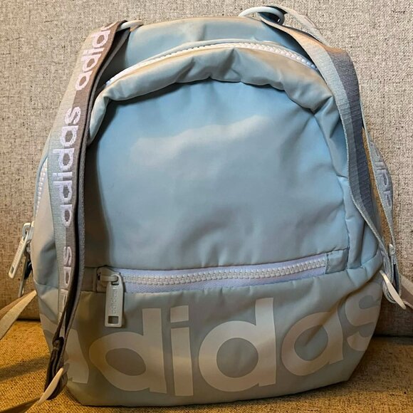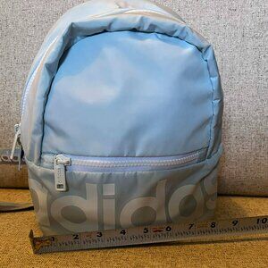 Cute and compact Adidas Linear Mini Backpack has a front zipper pocket and an inside mesh one.