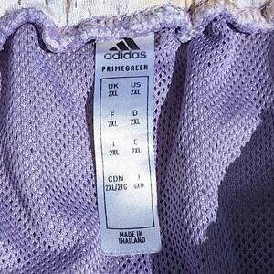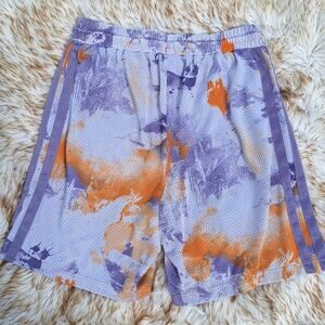 In excellent condition from adidas mens size 2XL Q2 basketball mesh shorts with all over purple white orange abstract print with pockets and drawstring waist