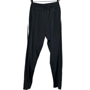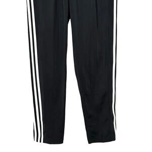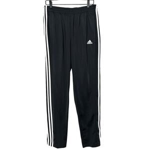 Adidas 3 stripes Essentials open hem performance pants in black and white size large. Elastic waistband with drawstring. Solid black with logo and iconic stripes in white. Two side pockets plus one back zip pocket. Straight leg and a classic fit. Excellent condition, like new. Measurements: inseam- 31 inches and Waist (laying down flat)- 15.5 inches.
