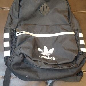 Sleek Adidas backpack with bold white stripes. Spacious and stylish for daily use.