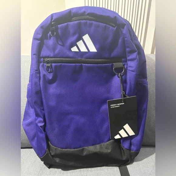 Stylish Adidas backpack with a striking purple design. Black accents enhance its modern look. Perfect for everyday use.