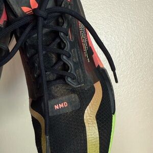 Adidas NMD sneakers with striking neon details. Black base with vibrant pink and yellow highlights.