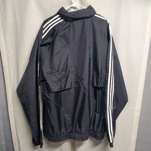 Adidas black windbreaker with white accents. Features Adidas logo with a hidden hood. Perfect for sporty look. Pre-owned and in excellent condition. See picture, the zipper has some marks.