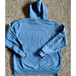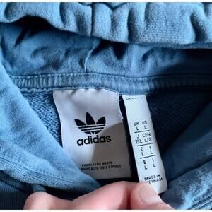 Classic Adidas hoodie in soft blue terry with a bold chest logo. Features a kangaroo pocket, adjustable drawstring hood, and ribbed trim. Good preowned condition—small flaw on sleeve (see photo).