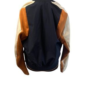 Womens Unisex Bomber Coat Athleisure Casual Sportswear Woven Baseball Jacket in Navy Blue and cream/Legend Ink and Linen