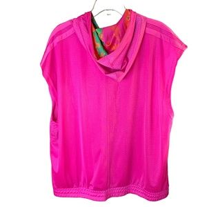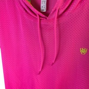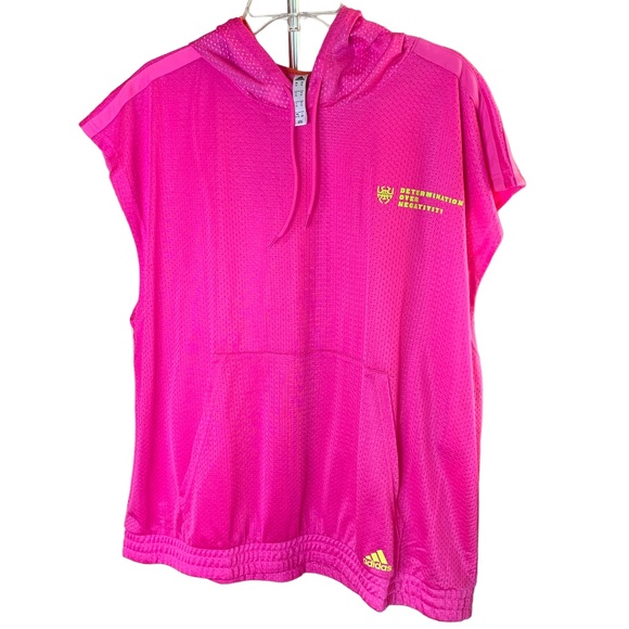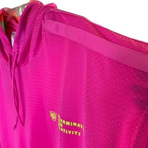 New with tags no barcode excellent condition. Color screaming pink. Loose fit, elastic hem, kangaroo pocket, drawstring hood with print lining, and color changing Donovan Mitchell and Adidas Badge of Sport logos. 100% recycled polyester mesh. Flat lay measuring approximately 28” length, 23” chest, 25” shoulder, and 12” armhole.