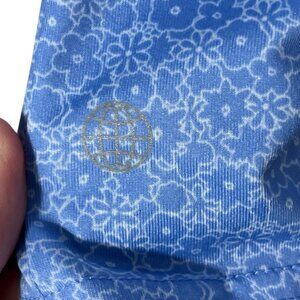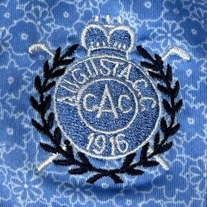 Style: Preppy, business casual, athletic. Light blue & white ditsy floral, embroidered Augusta CC logo on sleeve