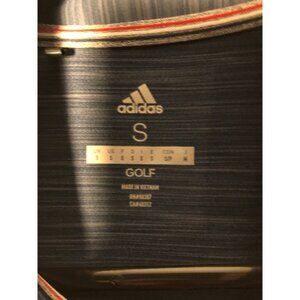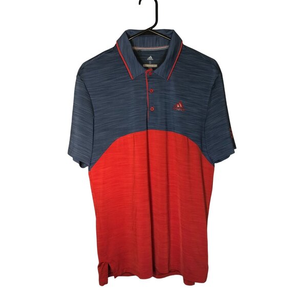 This Adidas golf polo shirt in men's size small is a standout piece designed for USA enthusiasts. Featuring a bold colorblock design of vibrant red and navy, the shirt exudes a sporty and patriotic vibe. Its lightweight, breathable polyester fabric ensures comfort and flexibility, whether on or off the golf course. Designed with a traditional three-button placket, embroidered Adidas logo, and "USA" graphic on the sleeve, it combines style with functionality. The textured stripe pattern enhances the overall appeal, while the structured collar and contrast piping add sophistication. Perfect for golfing or casual wear, this polo provides ease of movement and a polished look.