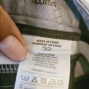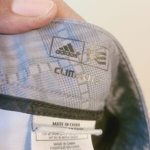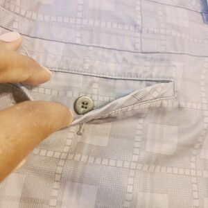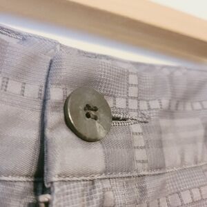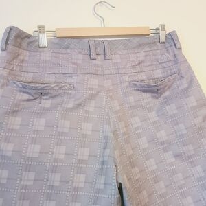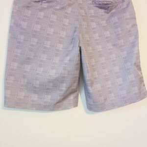 Men's gray/purple flat front plaid Climalite golf shorts by Adidas, size 32. Front slant and back button pockets. Logo on top right side under belt loops.
