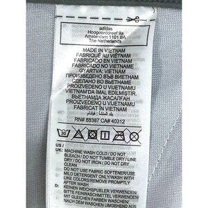 0408B- Adidas Men’s Adi Golf Pants, grey, GU2673, 07/22, 30 x 32. Made in Vietnam. RN88387. Button and zip closure. Tapered leg. Mid rise. Light stretch. Loops, flat front with sides slip pockets. Back horizontal pockets sewn closed. Black logo stitched on front left side. Black triple stripe logo on back right side. Sits at natural waist. Moisture wicking fabric. Thin, lightweight. Main material: 65% polyester recycled, 35% polyester, exclusive of trimming and decoration.