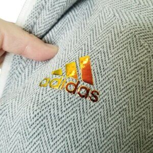 This Adidas jacket marries functionality with style. Featuring a full-zip closure, the piece boasts a subtle herringbone gray and white pattern accentuated with a gold logo for a touch of elegance. Crafted predominantly from breathable cotton, it is designed for comfort and ease, making it a versatile wardrobe addition.