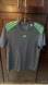 Sleek charcoal tee with vibrant green stripes. Ideal for sports or casual outings. Breathable and stylish. Keeps you dry. Logos all in excellent shape. Climalite.
