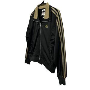 This Adidas track jacket features a lightweight design in black with tan accents and iconic three-stripe detailing along the sleeves. Zip-up closure and side pockets offer practical wear.