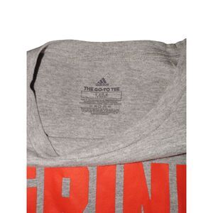 The Adidas Men's M Grind T-Shirt in gray features a bold design with the motivational phrase "Grind to the Top" prominently displayed. Crafted for comfort and style, this shirt is perfect for both casual wear and active pursuits. The vibrant orange accents enhance its visual appeal, making it a standout piece in any wardrobe. Ideal for those who embrace a determined mindset, this t-shirt combines functionality with a powerful message.