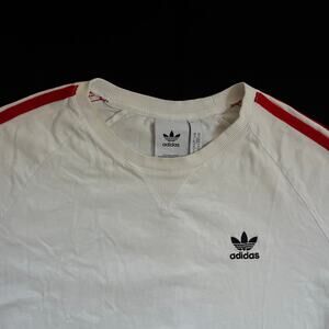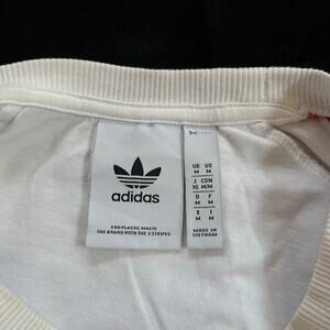 Classic Adidas Men’s Medium athletic shirt in white with signature three red stripes running down each sleeve.