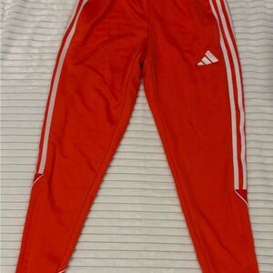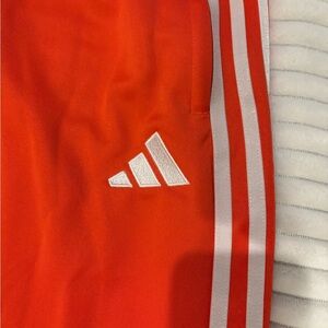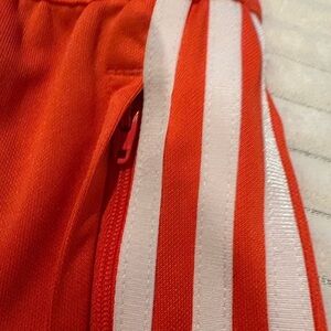 Vibrant Orange joggers with iconic white stripes. Perfect for active people. Comfortable fit. Zippers in pockets and at ankles. Men’s XS, worn once, great for older kids. Clean, like new!