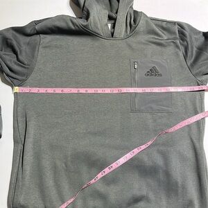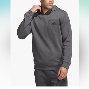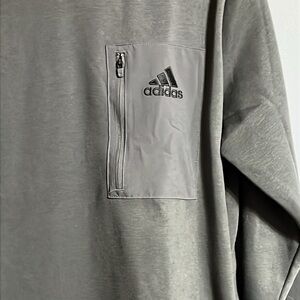 Stylish gray hoodie with Adidas logo. Features a front pocket and hood.