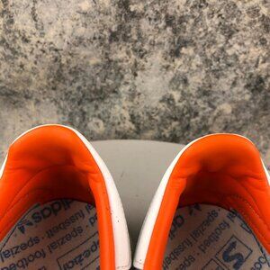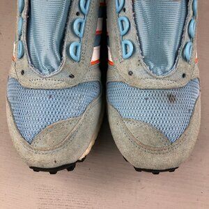 Men's Robert Brooks x Silverbirch Special SPZL Clear Blue, white, and orange retro style athletic sneakers, tennis shoes. Closed toe, lace-up closure, mesh uppers.