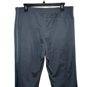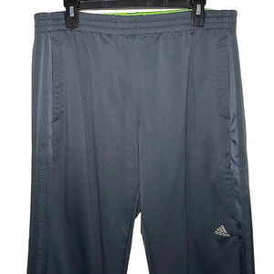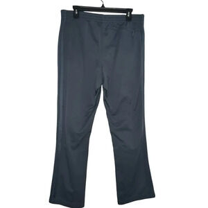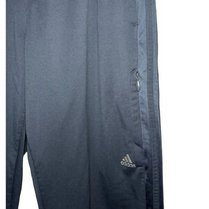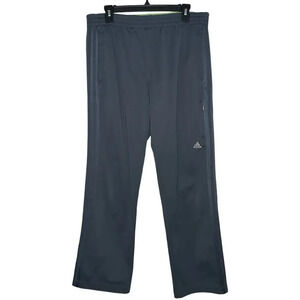 Adidas track pants size large. 100% polyester in a slate gray color with the iconic 3 stripes going down each leg in the same color. Regular relaxed fit with a straight leg and has moisture wicking. Elastic waistband with a drawstring, 2 side slash pockets, 1 back zip pocket and 1 upper left thigh zip pocket. Excellent condition! Measurements: inseam- 30 inches and Waist (laying down flat)- 17 inches