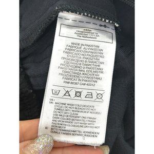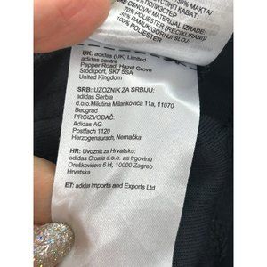 0017B- Adidas Men’s Track Pants, GK 0651. Training, warm-up, S, Black, open hem, made in Pakistan, drawstring inside 1.5 inch elastic waist. (Aglets are a bit frayed). Black triple stripes and 1 inch black stripe comes to right angles at calves in front and in back of leg . Adidas black Trefoil logo at left front hip. Back right hip patch with gold trefoil logo. Release date 11/19. 26” waist, 10” rise, 39.5” hips, 23.5” thighs. 19” knees, 11.5” leg opening, 10” ankle zip opening side slits. 27” inseam. 70%, polyester (recycled,) 30% cotton; overlay: 100% polyester. Machine wash cold, delicate cycle, do not bleach, do not tumble dry, warm iron if needed, do not dry clean, use mild detergent only, wash dark colors separately, wash and iron inside out, wash with fasteners closed, line dry, do not iron motif. Gently preowned. Very good condition.