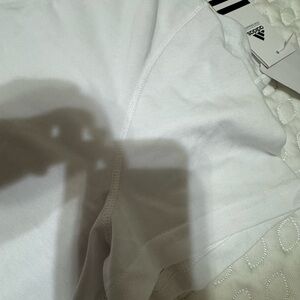 Experience comfort and style with the Adidas women White V-Neck Shirt. Perfect for casual outings or workouts, this shirt offers a sleek look with its classic white color and iconic Adidas logo.