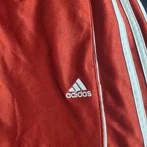 Classic Adidas red athletic shorts with iconic 3-stripe detail and logo on leg. Lightweight breathable 100% polyester. Elastic waist with drawstring. Perfect for workouts, sports, or casual wear.