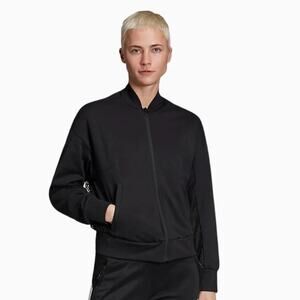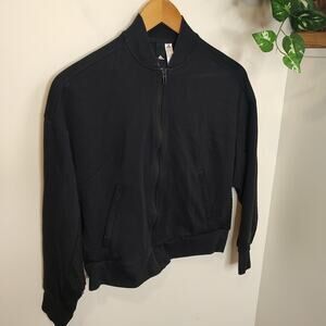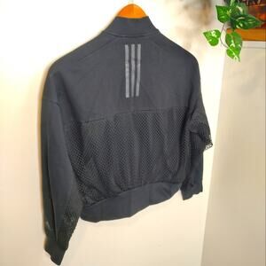 Adidas Mesh ID Full Zip Bomber Jacket in Black Size Small. Move throughout your active day in the comfort of this bomber jacket. Detailed with mesh overlays, the soft cotton build gathers at the back for a feminine look. Signature 3-Stripes flash down the center back for added style.
