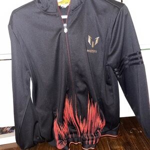 Adidas Messi Black & Orange Full-Zip Hoodie Jacket. This sporty jacket features a sleek black design with vibrant orange accents, including the hood lining and a dynamic graphic print along the bottom that resembles a sound wave or heartbeat. It has a full-zip front, a hood, and the Adidas logo on one sleeve, with the distinctive Messi logo and name on the chest. Three black stripes run down the other sleeve. Perfect for young athletes and Messi fans!
