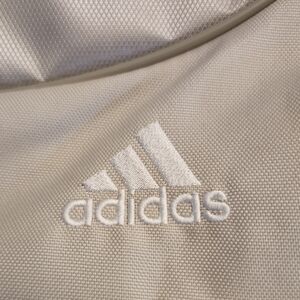 Sleek Adidas backpack with metallic gray finish. Features front zip pocket and signature three stripes.